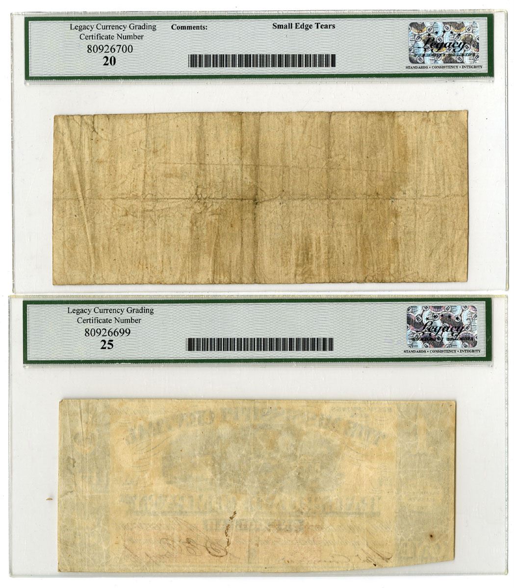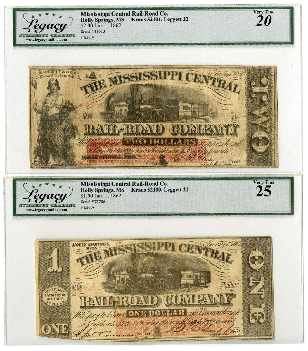 Holly Springs, Mississippi, January 1, 1862. Lot of 2 Issued Banknotes, Includes: $1 Kraus 52100 Leggett 21, S/N 32786 pp A, Legacy graded Very Fine 25; and, $2 Kraus 52101, Leggett 22, S/N 41613 pp A, Legacy graded Very Fine 20 with comment "Small Edge Tears." Notes are printed by Douglas Engravers. (2). Sold "AS IS" no returns accepted.