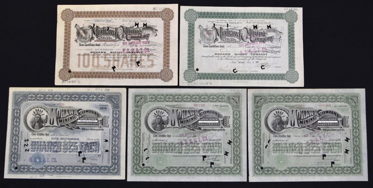 Michigan, Lot of 5 I/C Stock Certificates for various share amounts, Includes 1907, 1 Share, Black with green border, XF; 1908, 100 Shares, Black with Brown border and underprint, XF, both with ornate titles, but earlier versions of the better known and more common versions with the Mohawk Indian portrait as part of the title in the later dated certificates; and 2 examples of the Less than 100 Shares and 1 example of the 100 Share certificate, all with a Mohawk Indian at the top left. Certificates all have POCs and range from Fine to VF+ condition. (5).