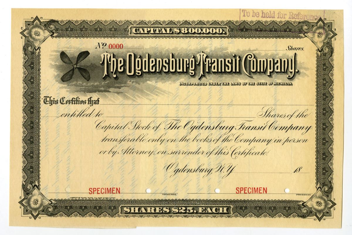 Ogdensburg, New York and Michigan, ND (1880-90s). Specimen Stock Certificate, Black printing with black border, Company title at top with small vignette of ships propeller at left, Specimen overprints and POC's, VF-XF condition, ABNC.