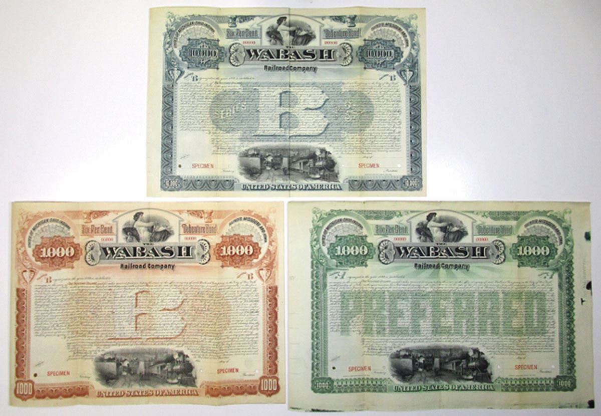 MI, OH, IN, IL, MO, IA, 1889 (1902 to 1906) Lot of 3 Specimen Bonds, Includes: 1906 $1000 Registered Series A 6% Debenture Bond, Black with green border; 1902 $1000 Registered 6% Series B Denture Bond, Black with brown border; 1905 $10,000 Registered 6% Series B Debenture Bond, Black with blue border. All have allegorical woman reclining at top, Men in railyard with trains at bottom, Specimen overprints, POCs, are in Fine to VF condition, printed by ABNC. (3). Sold "AS IS" no returns accepted.