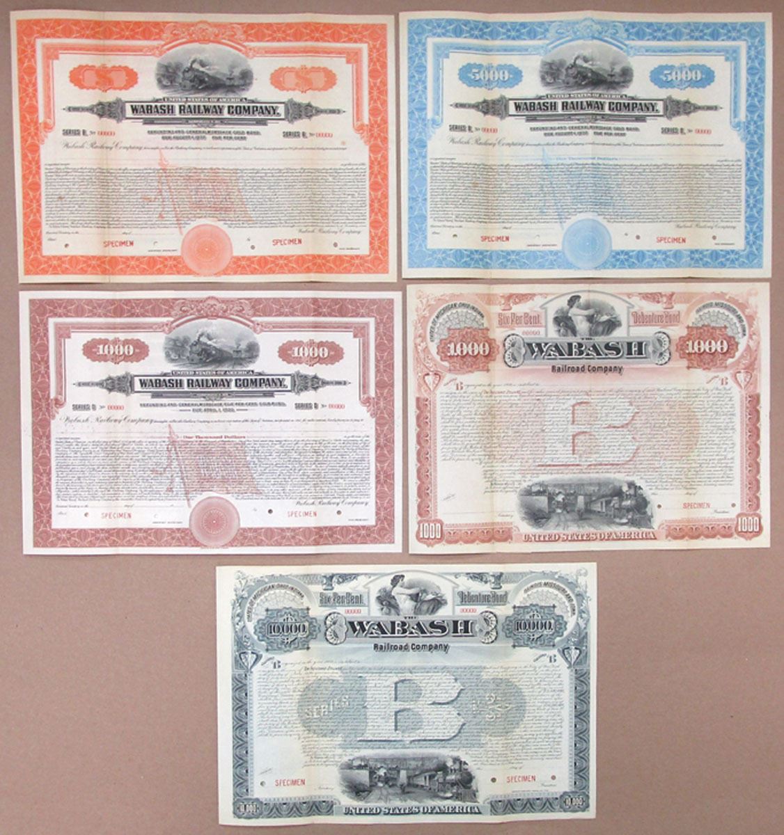 Michigan, Ohio, Indiana, Illinois, Missouri & Iowa., 1889 to ND (1970s). Lot of 5 Registered Specimen Bonds, Includes: $1000 6% Bond, due 1939; $10,000 6% Bond, due 1939; $- 5% Bond, due 1976; $5000 5% Bond, due 1976; and, $1000 5% Bond, due 1980. Bonds all have Specimen overprints, POCs, range from Fine to VF+ condition, and printed by ABNC. (5). Sold "AS IS" no returns accepted.