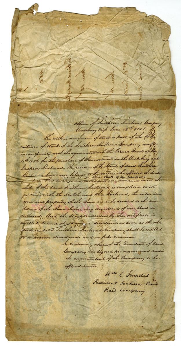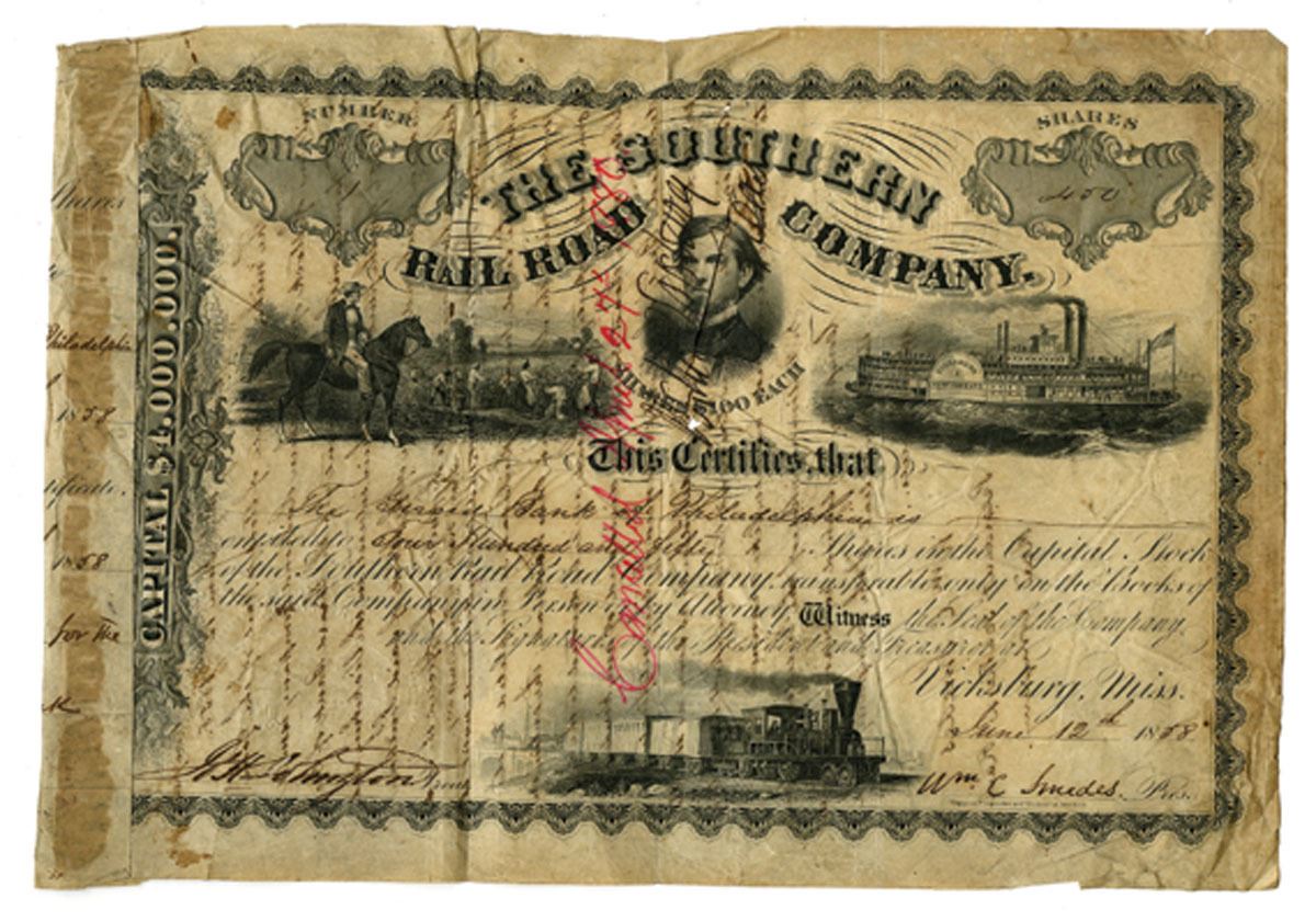 Vicksburg......, Mississippi, 1858. 450 Shares I/C Capital Stock Certificate, Black printing with decorative black border, Overseer of slaves picking cotton on horseback at left; The Steamboat "Vicksburg-New Orleans" at right; and, portrait of man at center, locomotive at bottom center, S/N 1, Red "Cancelled - June 27, 1880)" written vertically at center, VG condition with a few small internal holes or tears, counterfoil on left and minor glue stains where the counterfoil is attached. The certificate is issued the Girard Bank of Philadelphia, signed by William C. Smedes as President, The back has a very long endorsement discussing the company, the shares, the railroad and dividends related to the railroad, all hand written by Smedes. The Southern Railroad Company was organized in 1846 to build a line from Brandon through Meridian to the Mississippi-Alabama state line, with William C. Smedes at the first president. The entire line was completed in June 1861. After the Civil War the company was reorganized as the Vicksburg and Meridian Railroad. On February 1, 1889, it was sold under foreclosure to the owners of the Queen & Crescent, and on March 18 was reorganized as the Alabama & Vicksburg Railway. TCC. Unlisted as a stock certificate in Cox and very possibly unique with the designation of Serial #1 only adding to its desirability.
