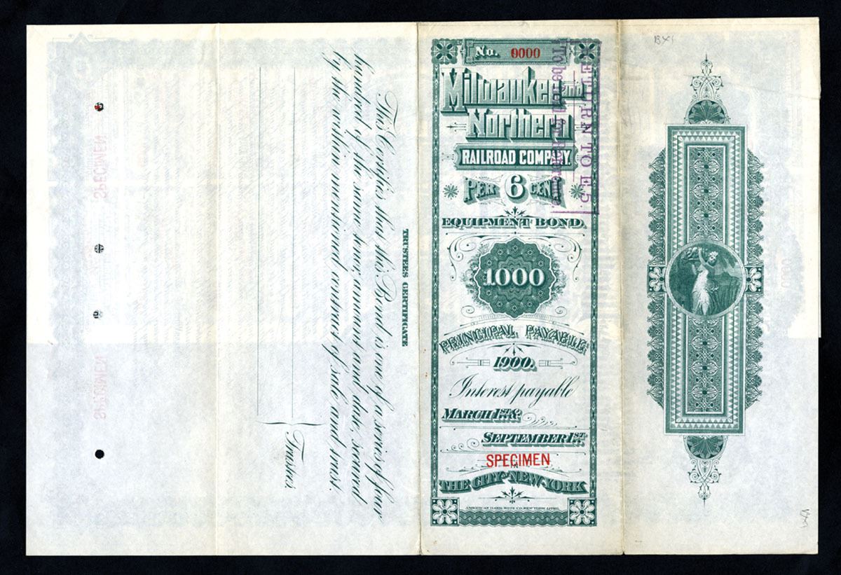 Wisconsin & Michigan. 1890, $1000 Specimen 6% Equipment Bond, Black print with a green border and under tint, locomotive exiting tunnel at top, Specimen overprints, POC's, VF-XF condition. ABNC. Unique in Archives, this was the only example found. This is the exact and only example photographed in Cox.