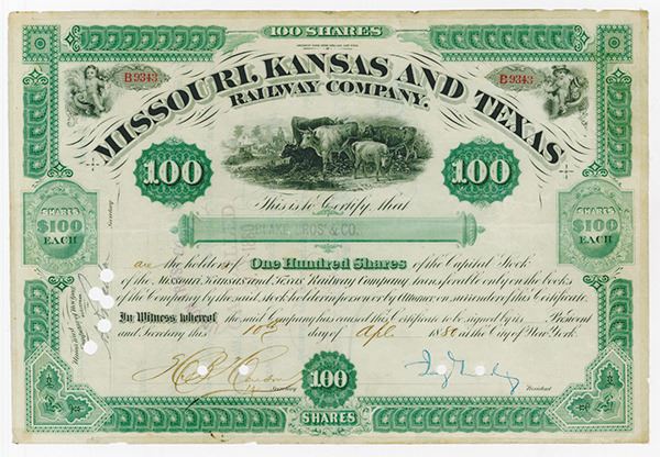 Texas, Missouri, Kansas. 100 Shares, I/C, certificate, green border and underprint, POC's, Gould's signature is very nice, Well known as a "Robber Baron". ABNC.