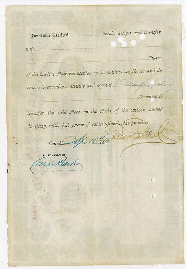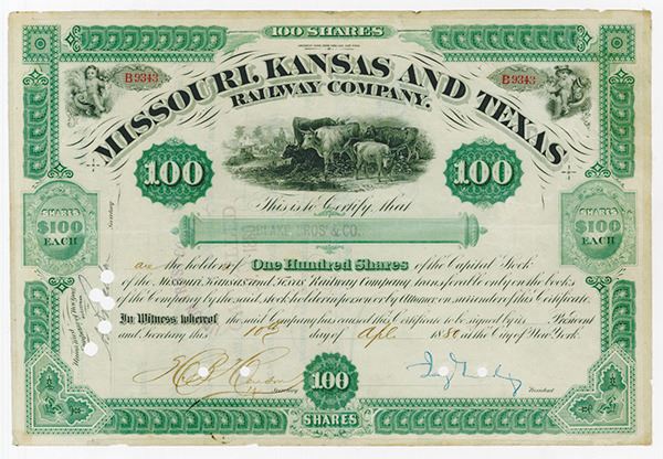 Texas, Missouri, Kansas. 100 Shares, I/C, certificate, green border and underprint, POC's, Gould's signature is very nice, Well known as a "Robber Baron". ABNC.