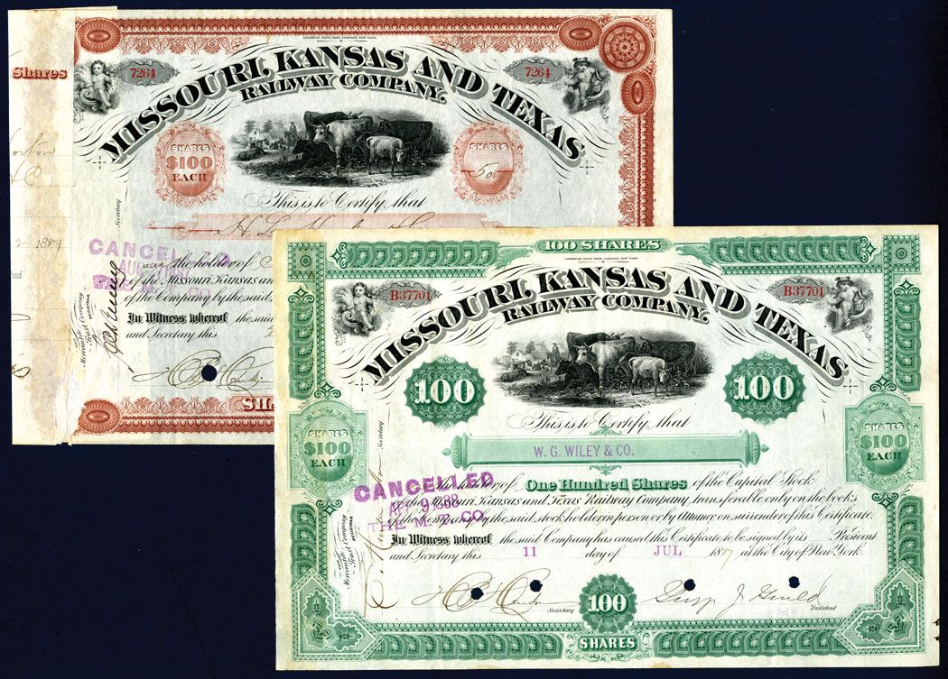 Lot of 2 certificates, 100 Shares, green and 100 Shares, brown, Fine. POC's.