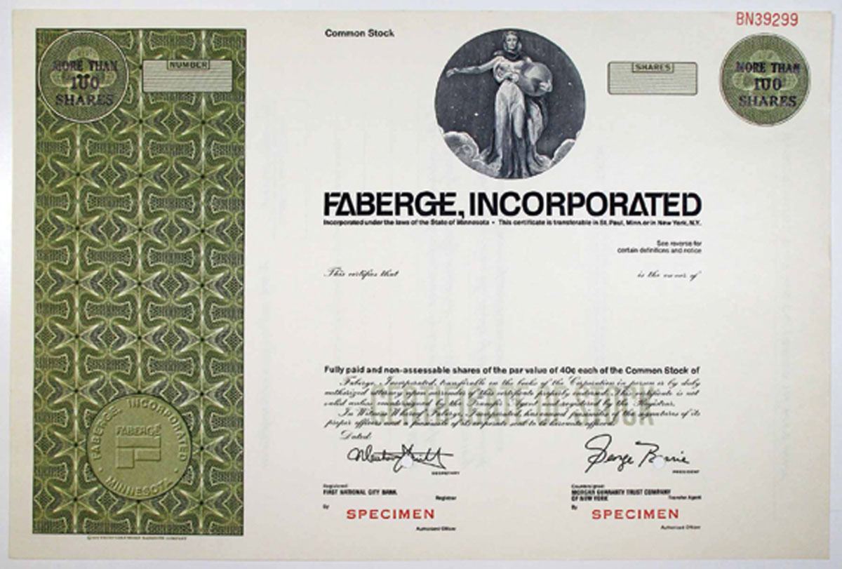 MN. Faberge, Inc., 1960s >100 Shrs Specimen Stock Cert., VF-XF SCBN Olive Green. Fabergé was a brand of cosmetics manufactured between 1964 and 1984 under the direction of George Barrie. In 1984, McGregor Corporation acquired Fabergé and discontinued many Fabergé products. In 2007, the trademarks, licenses and rights were transferred to Fabergé Limited, in the Cayman Islands,