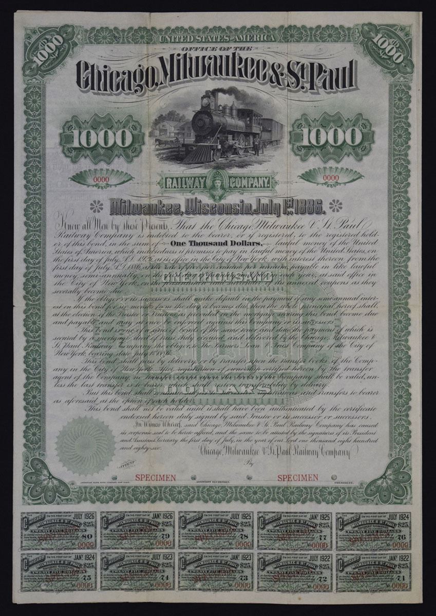MN., IL., WI., Chicago, Milwaukee & St. Paul Railway Co., 1886, Specimen Coupon Bond Rarity.