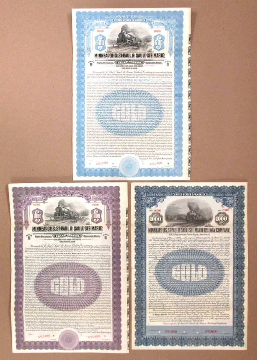 Minnesota, Michigan, Wisconsin, & Dakota, 1921-29. Lot of 3 Specimen Coupon Bonds, Includes: $1000, 6 1/2% Equipment Bond with Blue border, 1921; $500, Series B, 5 1/2% Bond with Light Blue border, 1929; and, $1000 Series B, 5 1/2% Bond with Purple border, 1929. All have Specimen overprints, POCs, are in VF to XF condition, printed by ABNC. (3). Sold "AS IS" no returns accepted. The Minneapolis, St. Paul & Sault Ste. Marie Railway, or "Soo Line," was founded in 1888 to connect the Midwest with Canada, mainly transporting grain and lumber. It became a key regional freight carrier and was later acquired by the Canadian Pacific Railway in the 1960s, eventually merging with it in the early 1990s. The 1921, $1000 Equipment bond is an unlisted earlier date and type in Cox, the other 2 Series B bonds are only known as specimens, no issued examples known. All are rare.