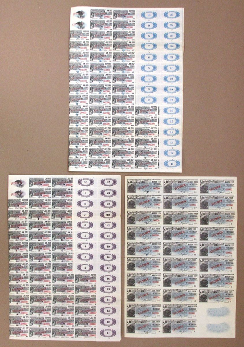 Minnesota, Michigan, Wisconsin, & Dakota, 1921-29. Lot of 3 Specimen Coupon Bonds, Includes: $1000, 6 1/2% Equipment Bond with Blue border, 1921; $500, Series B, 5 1/2% Bond with Light Blue border, 1929; and, $1000 Series B, 5 1/2% Bond with Purple border, 1929. All have Specimen overprints, POCs, are in VF to XF condition, printed by ABNC. (3). Sold "AS IS" no returns accepted. The Minneapolis, St. Paul & Sault Ste. Marie Railway, or "Soo Line," was founded in 1888 to connect the Midwest with Canada, mainly transporting grain and lumber. It became a key regional freight carrier and was later acquired by the Canadian Pacific Railway in the 1960s, eventually merging with it in the early 1990s. The 1921, $1000 Equipment bond is an unlisted earlier date and type in Cox, the other 2 Series B bonds are only known as specimens, no issued examples known. All are rare.