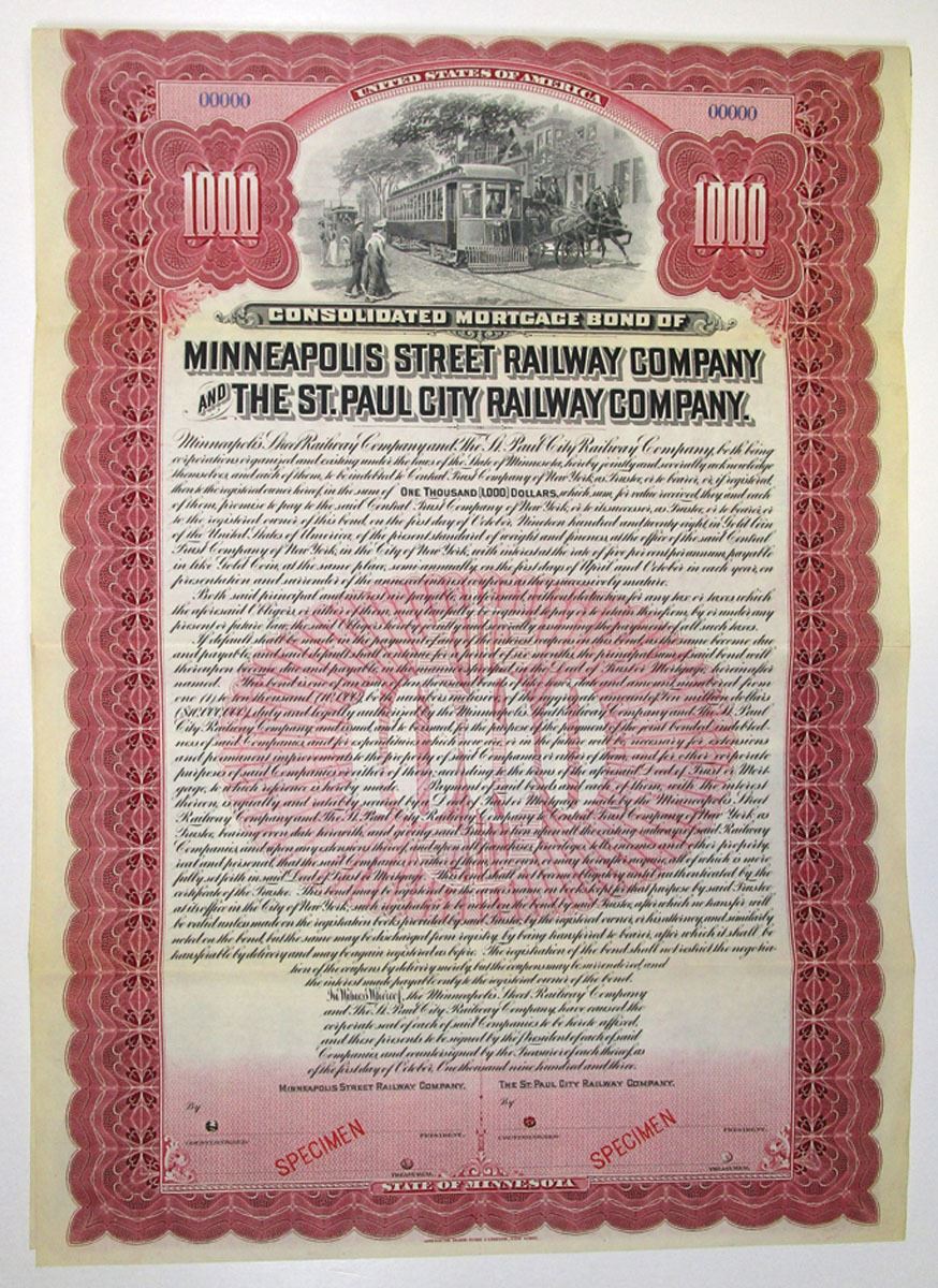 Minnesota, 1903. $1000 Specimen Consolidated Mortgage Coupon Bond, Black with maroon border and underprint, Electric railcar besides horse drawn carriage with people in the street, Specimen overprints and POCs, VF to XF condition, ABNC. Only known as a specimen in Cox.