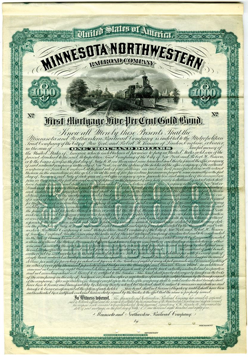 Minnesota, 1884. $1000 Specimen 5% First Mortgage Gold Coupon Bond, Black text with green border and undertint, Boy waving at passing train at top center. POCs, Plate cancellation stamp and handwritten details on back. VF-XF condition. Rare in Cox, only listed as a specimen, FBN.