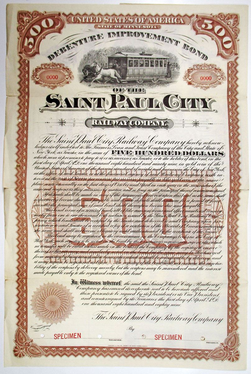 Minnesota, 1889. $500 Specimen 7% Debenture Improvement Coupon Bond, Black text with brown border and undertint, Saint Paul City streetcar pulled by horses at top center. Red specimen overprints, 0000 serial numbers, and POCs. Fine condition with some splitting along fold lines, ABNC. Unlisted denomination and color in Cox, This is the only example found in the ABN Archives.