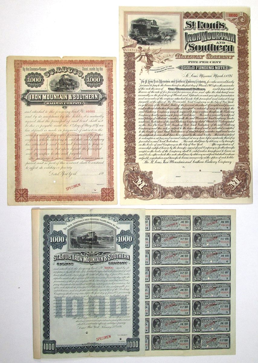 Missouri, Arkansas, 1895. Lot of 3 $1000 Specimen 5% Coupon Bonds, including: First Mortgage Extended Bond with brown border, Train next to conductor at top center, ABNC; Gold Funding Bond with brown border, Man on horseback looking at passing train at top left corner, IBN; and Arkansas Branch Extended Bond with blue border, Train passing on tracks at top center, ABNC. All have specimen overprints and POCs. Condition ranges from Fine to VF, some with archival repairs along fold lines. Bonds are unlisted in Cox, Rare. (3). Sold "AS IS" no returns accepted.