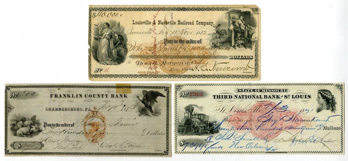 Missouri, Kentucky & Pennsylvania....., 1871-73. Lot of 3 I/C Obsolete Checks, Includes: Missouri, 1871, Third National Bank of St. Louis $7,399.58 I/U Check with Imprinted Revenue; Kentucky, 1872, Louisville & Nashville Railroad Co. $40,000 I/C Check with Imprinted Revenue; Pennsylvania, 1873, Franklin County Bank, $200 I/U Check with Imprinted Revenue. Checks range from Fine to VF+ condition. (3). Sold "AS IS" no returns accepted.