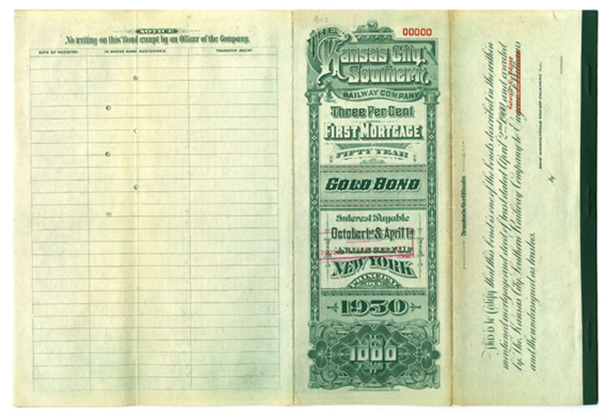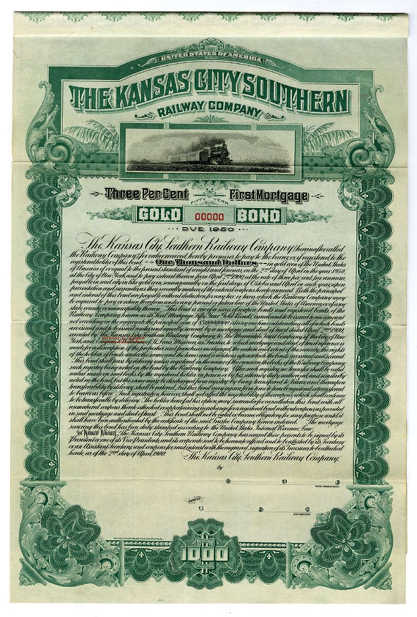 Missouri, 1900 Specimen $1000 First Mortgage 3% Gold Coupon Bond, Black text with ornate green border and undertint, Passenger train approaching in rectangle at top. No specimen overprints, "00000" serial number and POC's, VF-XF condition. Only listed as a specimen in Cox. Only 2 examples were found in the ABN Archives in 2002.