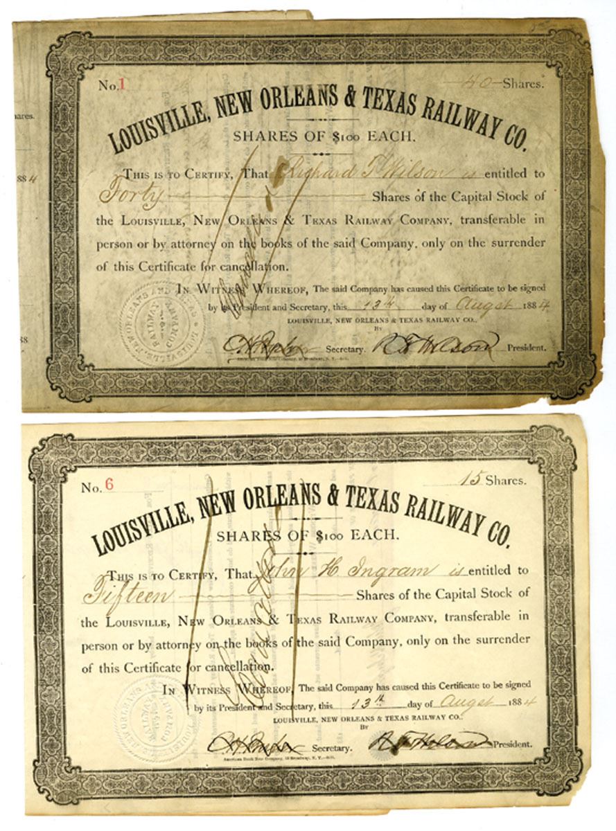 Missouri, 1884. Lot of 2, I/C Stock Certificates, First for 40 Shares and other for 15 Shares Capital Stock, Both have black print with black border and company title at top, S/Ns 1 & 6, Pen Cancelled overprints, Certificates range from Fine to Choice Fine condition. ABNC. (2). Sold "AS IS" no returns accepted.