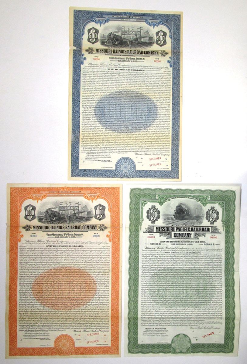 Missouri. Lot of 3 Specimen 5% Coupon Bonds, includes: 1928, Missouri Pacific Railroad Co. $1000 First and Refunding Mortgage Gold Bond with green border, featuring an approaching train at top center; 1929, Missouri Illinois Railroad Co. $500 and $1000 First Mortgage Bonds, both with men working between two trains at top center, blue and orange borders. ABNC. All have Specimen overprints and POCs, and are in VF condition with archival reinforcement along fold lines. (3). All are Unlisted in Cox, Rare and attractive trio.