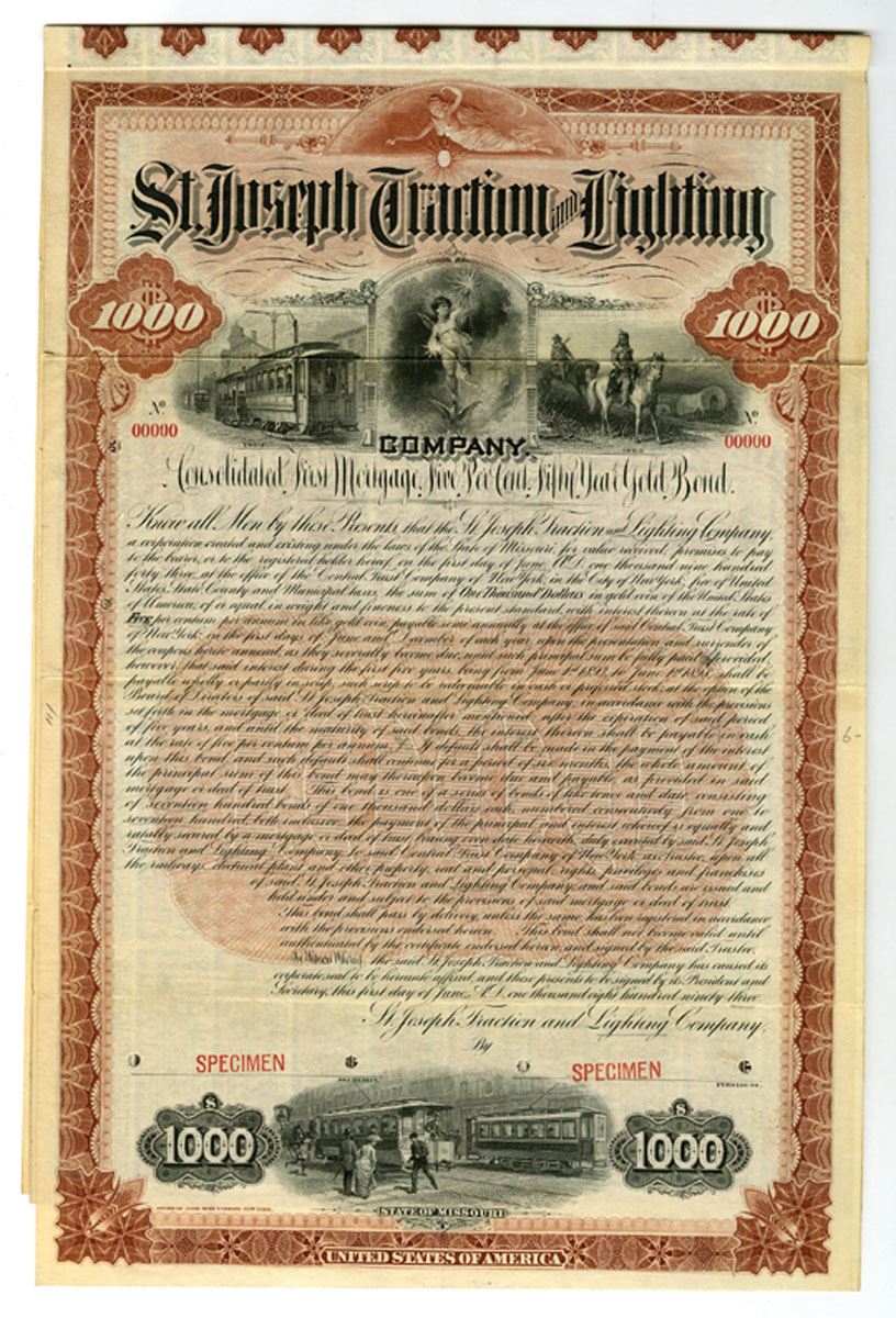 Missouri, 1893. $1000 Specimen 5% Consolidated First Mortgage Gold Coupon Bond, Black printing with brown border, Cherub at top center flanked by a trolley car and a Native American. Red specimen overprints, 00000 S/Ns, and POCs. VF condition with archival reinforcement. ABNC. Rare bond that is only known as a specimen in Cox. It is estimated $750 to $1000 in Cox.