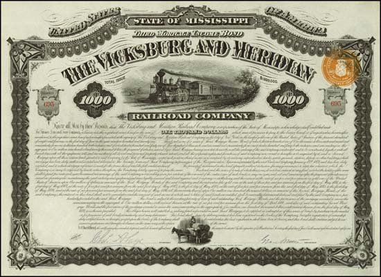 Issued and uncancelled bond. 1881. $1000. Registered 3rd Mortgage Income Bond. Ornate black border. Speeding locomotive R-L and slaves with mule and wagon full of cotton bales. XF condition. Dutch revenue imprint in orange on UR. ABNC. Attractive and scarce bond.