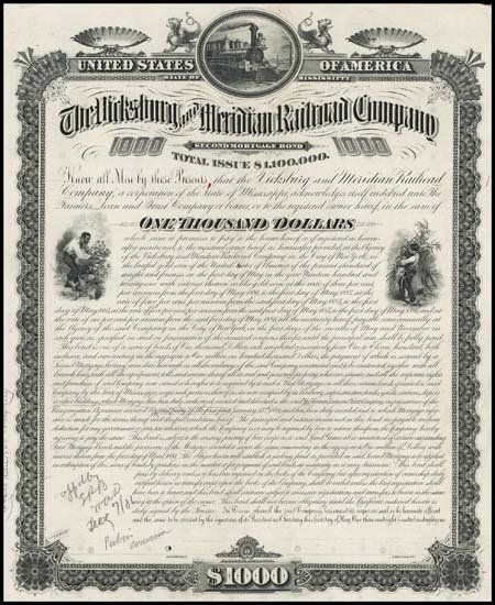 1881. Proof bond. $1000. 2nd Mortgage 4% Gold Bond. Black border, no undertint. Speeding Locomotive in oval on top, slave picking cotton on left and farmer holding corn stalks on right. POC's. Printed on india paper. Approval signatures on bottom. Coupons included with back proof. ABNC. XF condition. Unique proof in archive. Unlisted design and bond terms.