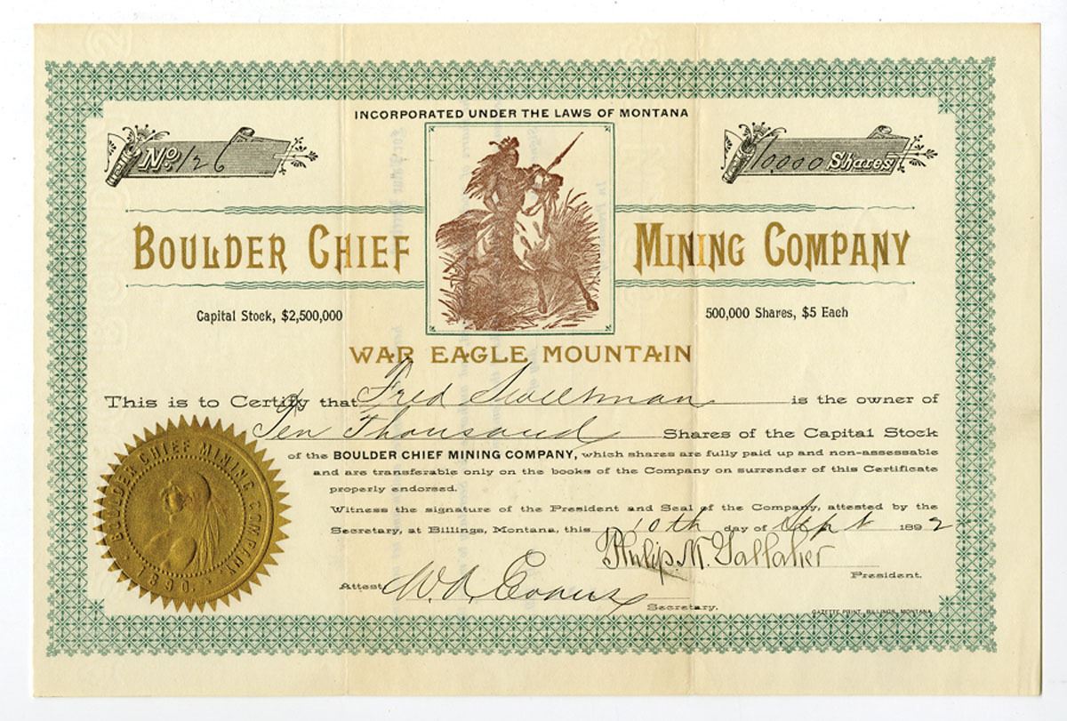 Billings.., Montana, 1892. 10,000 Shares I/U Stock Certificate, Black and gold print with green border, Indigenous person on horseback at center with another indigenous person on gold seal at bottom left, S/N 126, VF to XF condition.