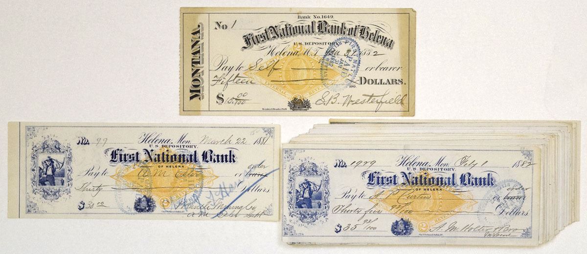 Helena, Montana, 1881-82. Lot of 39 Issued bank checks from First National Bank of Helena, U.S. Depository. Designs feature the distinctive blue engraved miner vignette at left, ornate borders, orange revenue stamps, and multiple Helena bank cancellation markings. Condition ranges from Fine to Very Fine overall, with folds, light edge wear, and normal banking stamps. (39). Sold “AS IS” no returns accepted.
