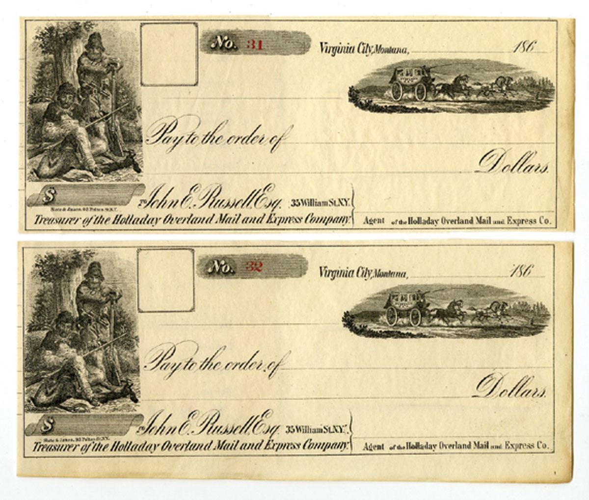 Virginia City, Montana Territory, 1860s. Lot of 2 Unissued Bank Checks, Black print with horse drawn carriage at right and pioneers at left, S/Ns 31 & 32, Checks are in VF to AU condition. (2). Founded by entrepreneur Ben Holladay, this company operated one of the most extensive stage and mail systems in the American West during the 1860s. Holladay purchased the assets of the defunct Central Overland California & Pikes Peak Express Co.—the parent of the famed Pony Express—making his line its direct successor. The company carried passengers, mail, and express freight across the Overland Trail between the Missouri River and the Pacific, serving key routes through Utah, Colorado, and the Montana Territory until its sale to Wells Fargo & Co. in 1866.