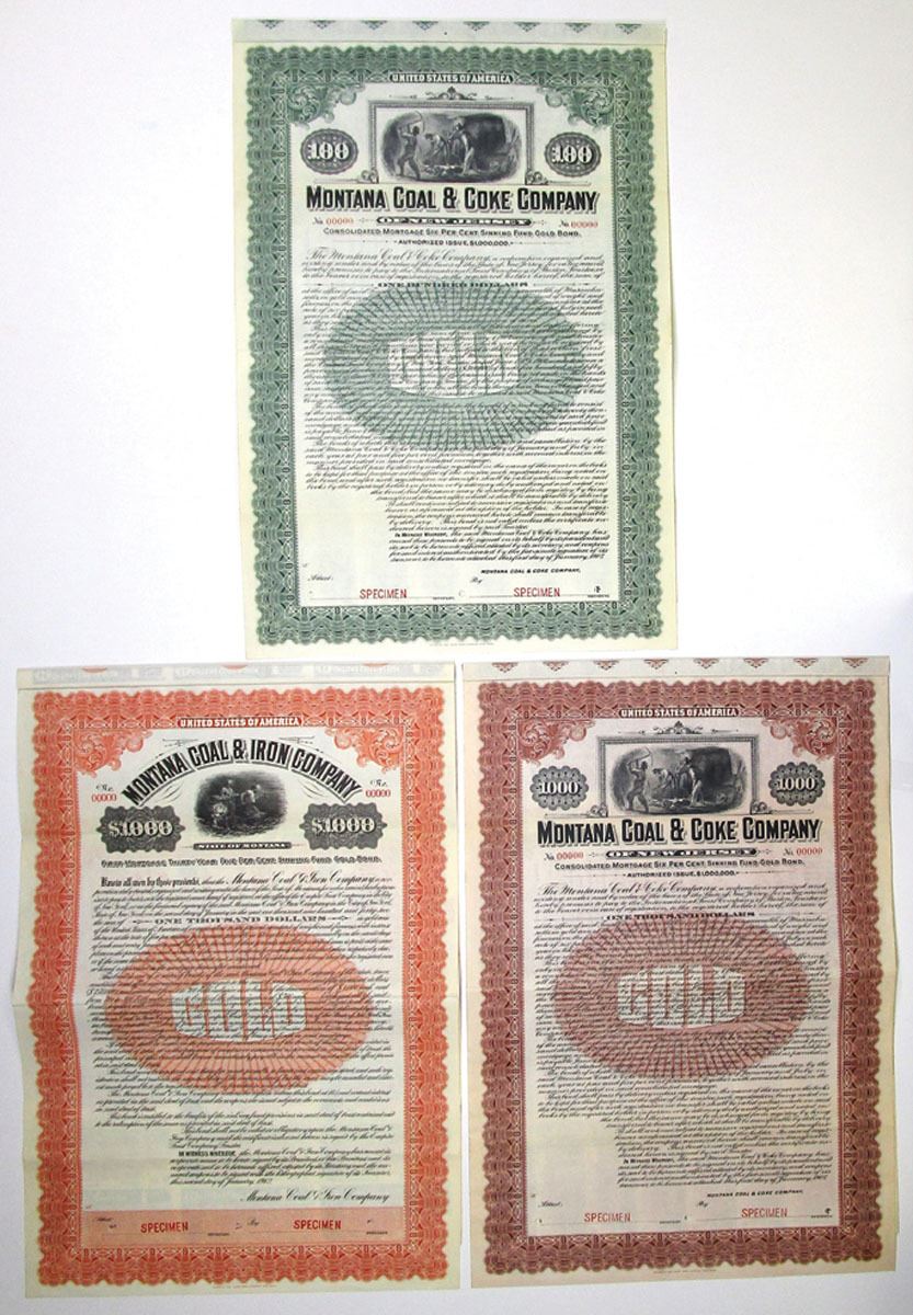 Montana & New Jersey, 1907 and 1912. Lot of 3 Specimen Bonds, Includes: 1907, Montana Coal & Coke Co. $100 (with green border) & $1000 (with brown border) 6% Consolidated Mortgage Sinking Fund Gold Coupon Bonds, Both with the same mining vignette, Specimen overprints, POCs, and are in VF condition; and, 1912, Montana Coal & Iron Co., $1000 5% First Mortgage Sinking Fund Gold Coupon Bond, Orange border and underprint, Mining vignette at top, Specimen overprints, POCS, VF-XF condition. All 3 were printed by FL-ABNC. All are rare with only 3 to 5 examples found in the ABN Archives, no issued examples have been seen previously. (3). Sold "AS IS" no returns accepted.