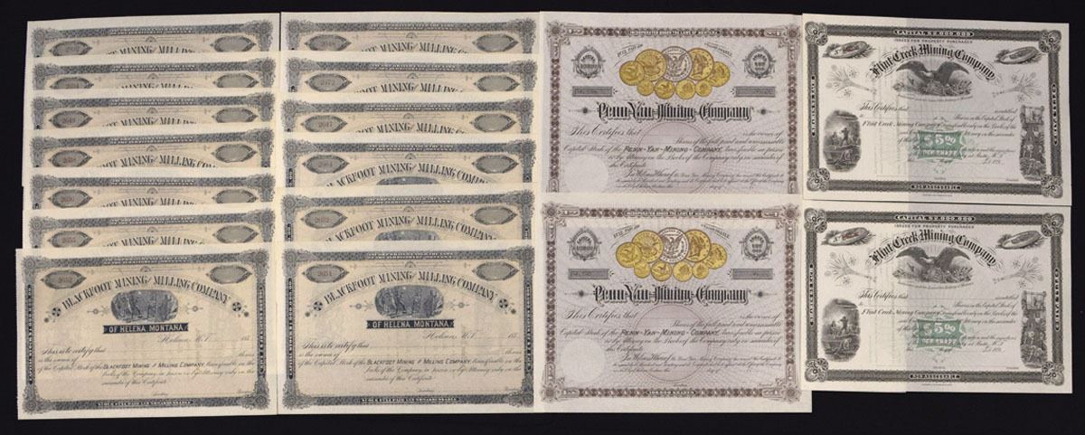 Montana, 1880s-1990s. Lot of 17 U/U Stock Certificates, includes Penn-Yan Mining Company (2), with outstanding gold and silver coin vignette; Flint Creek Mining Co.; and, Blackfoot Mining and Milling Co.. Certificates are in XF to Uncirculated condition. (17). Sold "AS IS" no returns accepted.