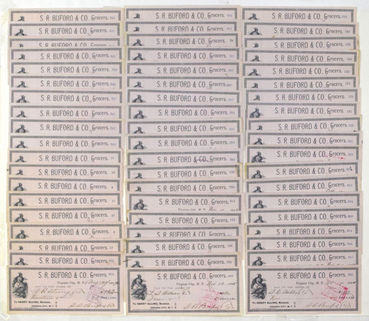 Virginia City, Montana Territory, 1888-89. Lot of 57 I/C checks, Black print on lilac underprint with Native American vignette at left, Checks have 'Paid' stamps at right side, An attractive and uniform group representing early Montana territorial commerce and banking history from one of Virginia City’s most prominent 19th-century merchants. VF–AU condition overall. (57). Sold "AS IS" no returns accepted.