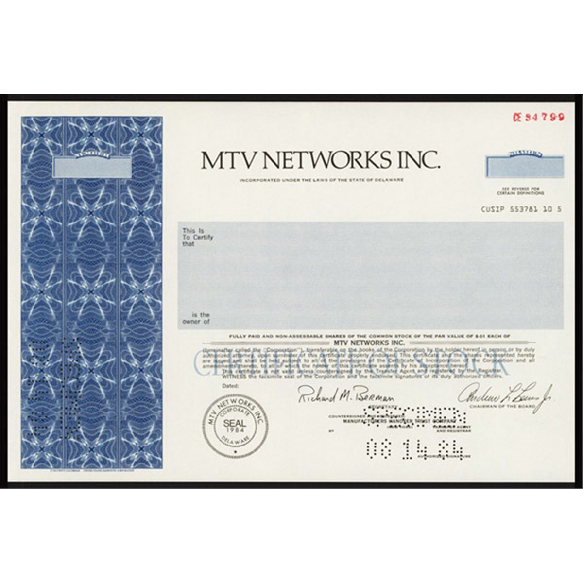 1984, Odd Shares, Specimen Initial Public Offering (IPO) Stock certificate, MTV title and Blue end panel, XF condition, Pin punch Specimen, This company changed the face and nature of the music business with their 24 hour music video television station. SC-USBN. Historic and rare IPO certificate.