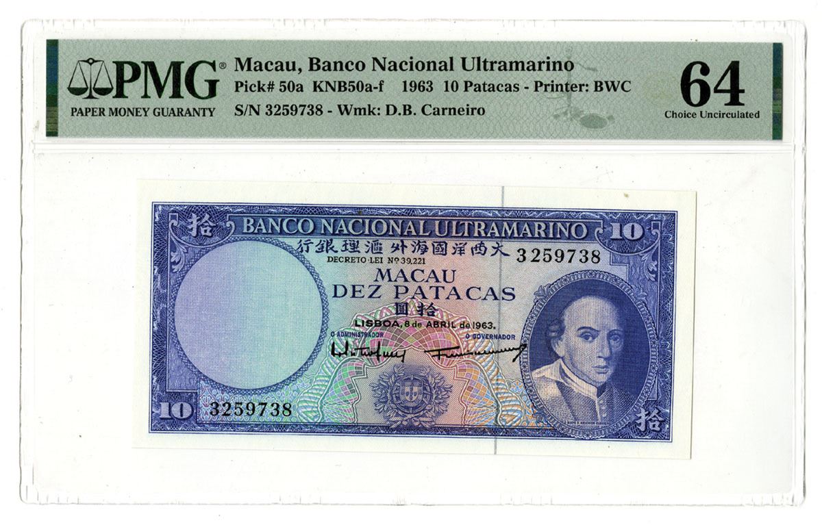Macau, 1963. 10 Patacas, P-50a KNB50a-f, Issued Banknote, Deep blue-violet on m/c underprint with portrait of Bishop D. Belchior Carneiro at right, Back is blue and pink with woman and sailing ships at center, S/N 3259738, PMG graded Choice Uncirculated 64, BWC.