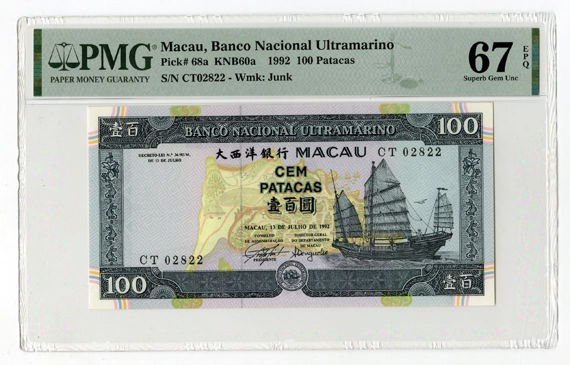 Macau, 1992. 100 Patacas, P-68a, Issued Banknote, Black on m/c underprint with early painting of settlement at center and junk at right, Back is blue and m/c with modern city view at center, S/N CT02822, PMG graded Superb Gem Uncirculated 67 EPQ.