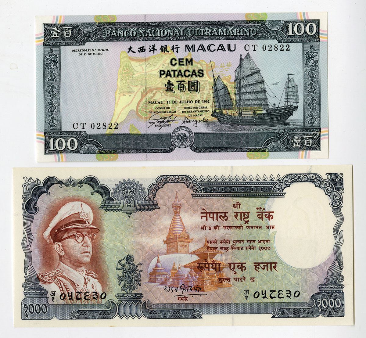 Macau & Nepal..., ND (1972)-1992. Lot of 2 Issued Banknotes, Includes: Macau, Banco Nacional Ultramarino 100 Patacas, P-68a, 1992, Black on m/c underprint with early painting of settlement at center and junk at right, S/N CT02822; and, Nepal, Central Bank of Nepal 1000 Rupees, P-21, ND (1972), Blue on m/c underprint with King Mahendra Vira Vikrama at left, S/N A 058630. Banknotes range from AU to Uncirculated condition. (2). Sold "AS IS" no returns accepted.