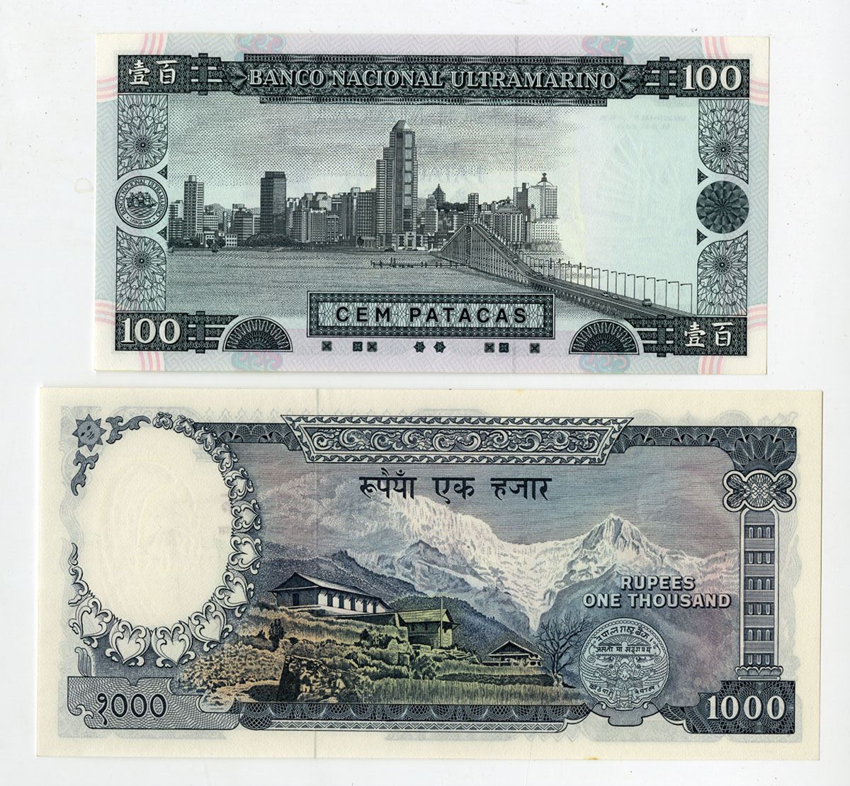 Macau & Nepal..., ND (1972)-1992. Lot of 2 Issued Banknotes, Includes: Macau, Banco Nacional Ultramarino 100 Patacas, P-68a, 1992, Black on m/c underprint with early painting of settlement at center and junk at right, S/N CT02822; and, Nepal, Central Bank of Nepal 1000 Rupees, P-21, ND (1972), Blue on m/c underprint with King Mahendra Vira Vikrama at left, S/N A 058630. Banknotes range from AU to Uncirculated condition. (2). Sold "AS IS" no returns accepted.