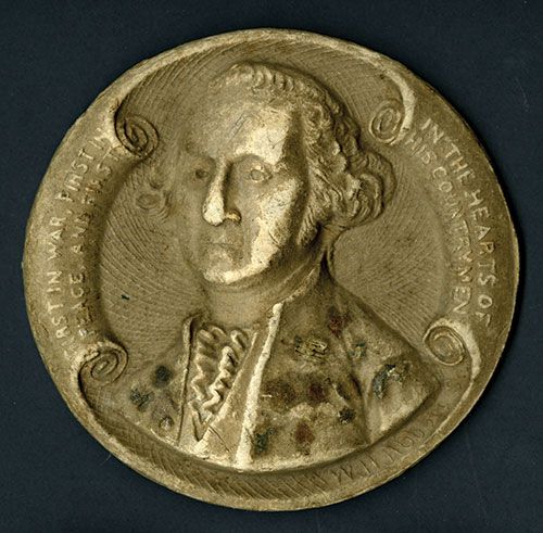 ND, ca. 1870-80's, 4 inch diameter medallion made of macerated currency with Washington in middle with sayings on borders, back with statement “National Currency Souvenir - Washington, D.C. - Made of……$3000”, Some wear on face but over all in excellent condition with no chips or damage. popular Treasury Department collectible.