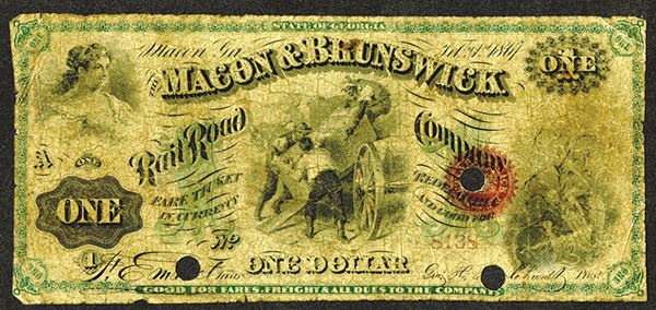 United States. Georgia. Macon & Brunswick Rail Road Co. 1.2.1867. $1.00 "Fare Ticket". Continental BNC. POC, Fair-Good.