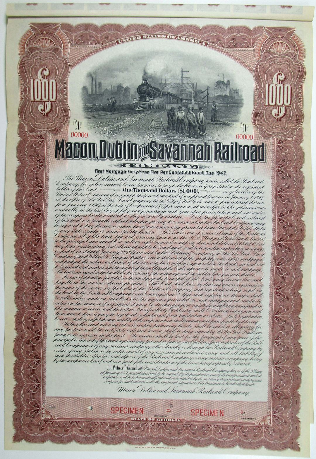 Georgia, 1907. $1000 Specimen 5% First Mortgage Gold Coupon Bond, Black text with brown border and undertint, Train passing by with men at work at right. Red specimen overprints, 00000 serial numbers, and POCs. VF condition, ABNC. Only known as a specimen in Cox but not previously seen. This was one of 2 examples found in the ABN Archives in 2002 and this is the only example available.
