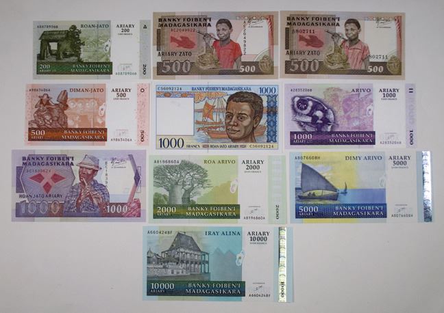 Madagascar......, ND (1974)-2007. Lot of 13 Issued Banknotes, includes: Banky Foiben'ny Repoblika Malagasy 50 Francs=10 Ariary, P-62a; 1000 Francs=200 Ariary, 65a; 5000 Francs=1000 Ariary, 66a. Banky Foiben'i Madagasikara 200, 500, 1000, 2000, 5000, 10,000 Ariary spanning across modern times. P-67b; 71a; 72a; 76b; 87a; 88a; 89a; P-90a; 91a; 92a. Notes range from XF-AU condition. (13). Sold "AS IS" no returns accepted.