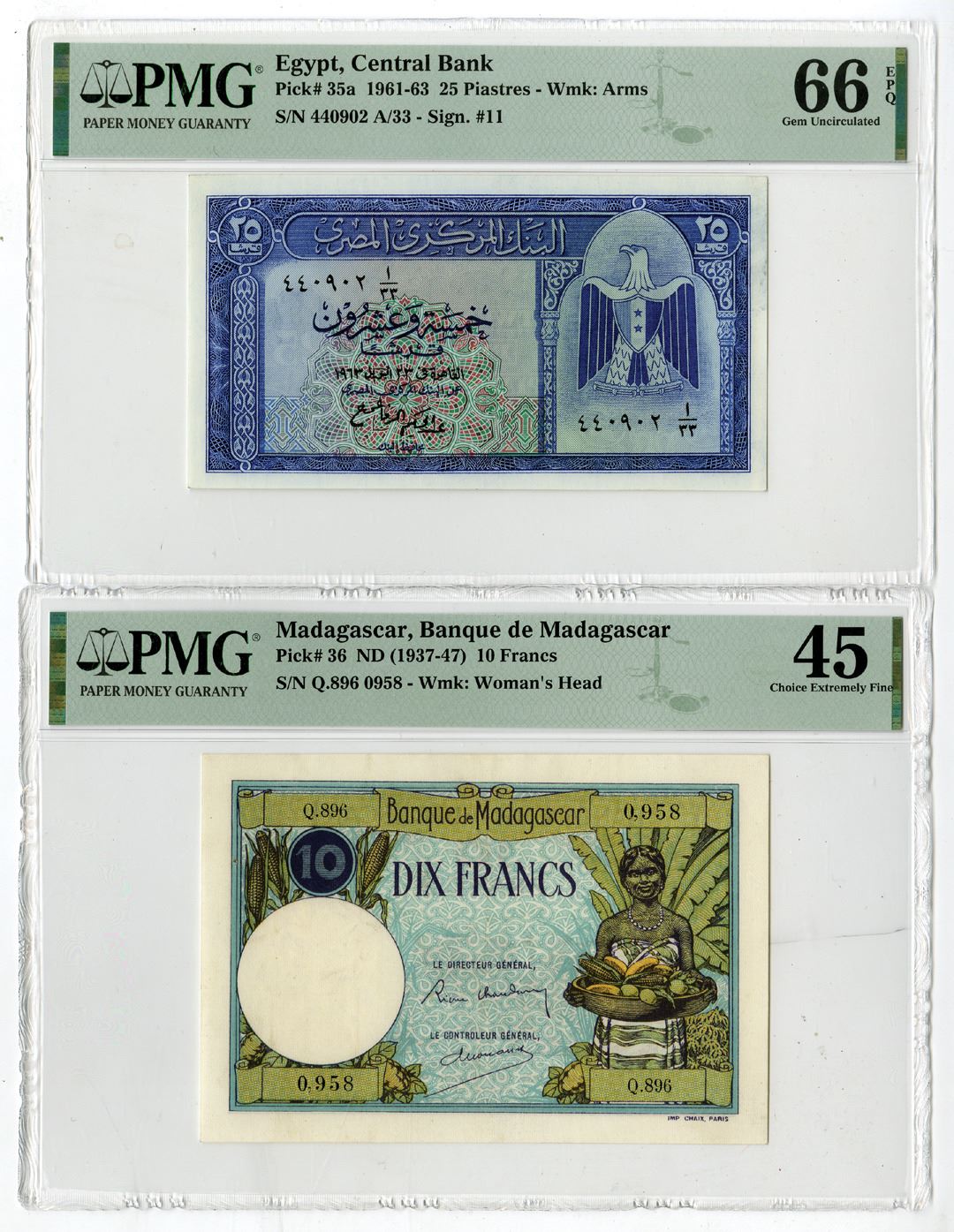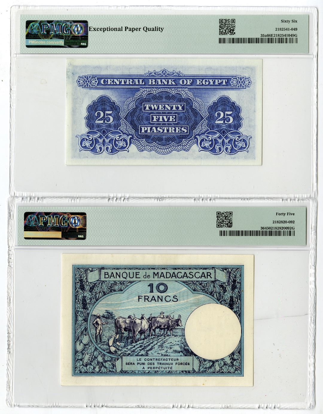 Madagascar & Egypt, ND (1937/47)-1961/63. Lot of 2 Issued Banknotes, Includes: Banque de Madagascar 10 Francs, P-36, Dark blue on m/c underprint, S/N Q.896 0958, PMG graded Choice Extremely Fine 45; Central Bank of Egypt 25 Piastres, P-35a, Dark blue on light blue and m/c underprint, S/N 440902 A/33, PMG graded Gem Unc 66 EPQ. (2). Sold "AS IS" no returns accepted.