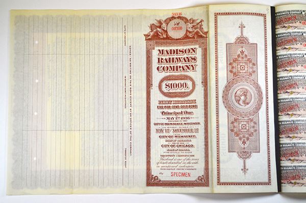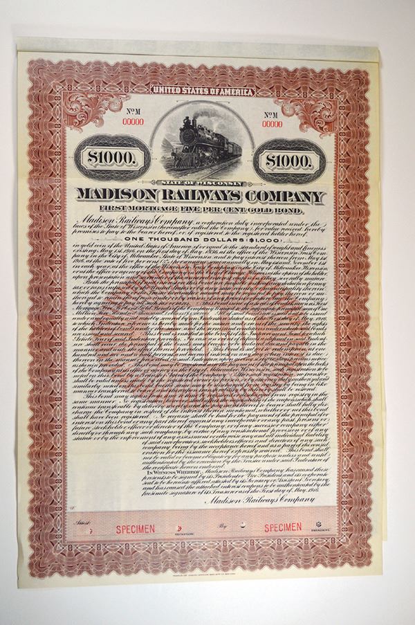 Madison, WI, 1916, $1000, 1st Mort. 5% Gold Coupon Bond, red brown, locomotive R-L, POC's, XF condition, FLD-ABNC. Unlisted railroad in Cox. Only 2 were found in the ABN Archives.