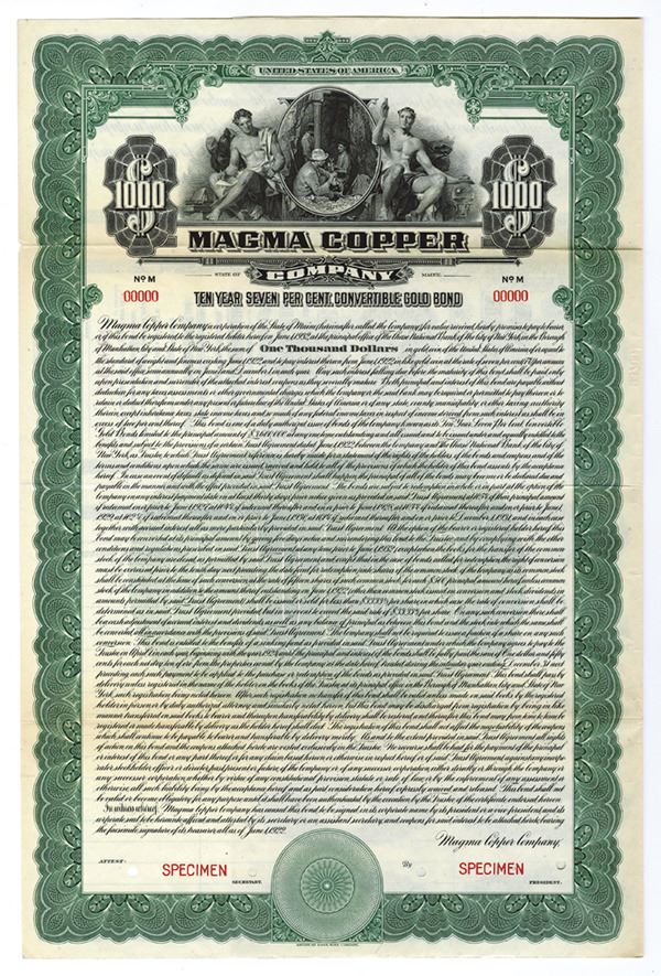 Maine, 1922, $1000, 10 Year 7% Convertible Gold Specimen Bond, Black on green border and underprint, Mining vignette flanked by two male allegorical figures top center, POC's red SPECIMEN overprints and red s/n "00000", VF condition, ABNC.