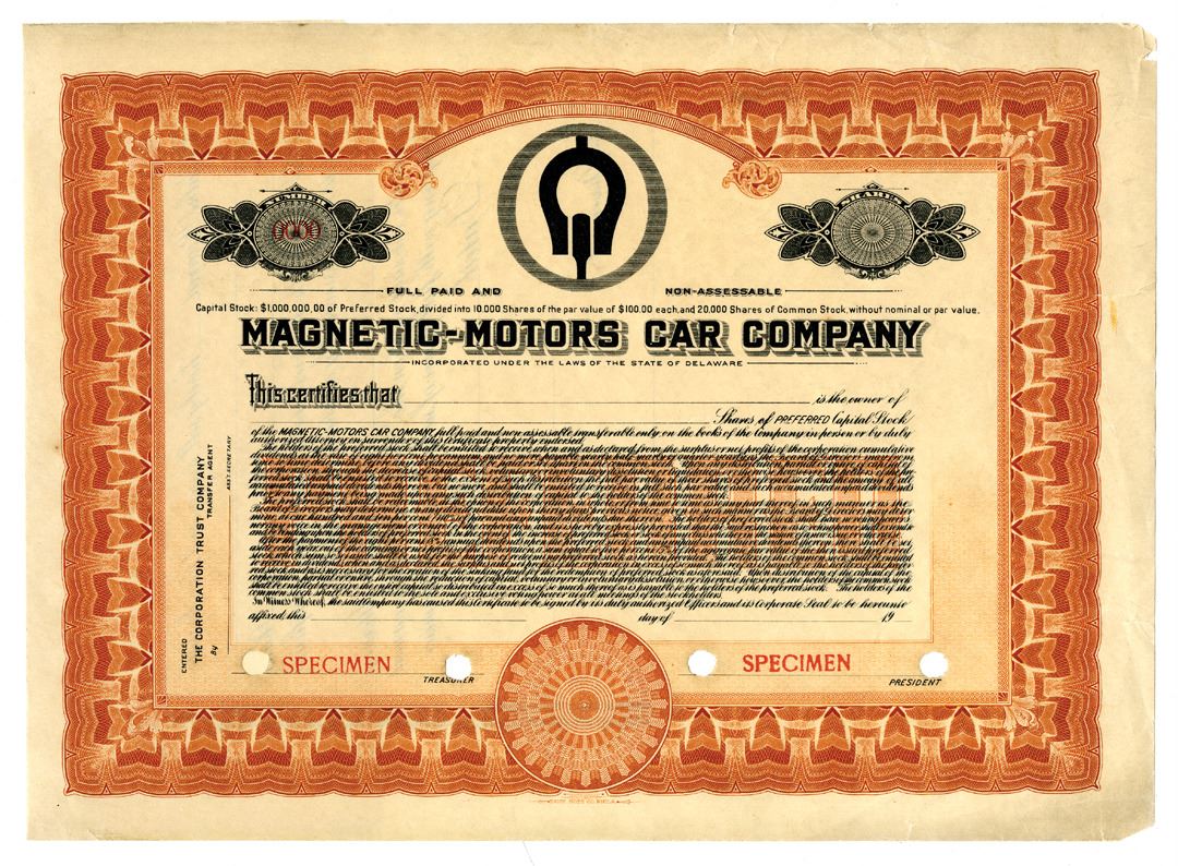 Delaware, ND (ca.1920s). Preferred Stock Specimen Certificate, Black on orange/brown border and underprint, Company logo at top, Specimen overprint and POCs, Fine-VF condition, SBNC. Only 3 examples of this specimen were found in the ABN archives in 2005.
