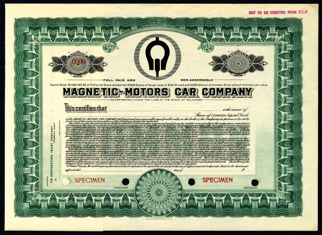 Odd Shares, Specimen stock certificate. Red "Specimen" overprints, "00000" serial numbers and POC's. Green border with magnet vignette. Choice uncirculated.