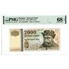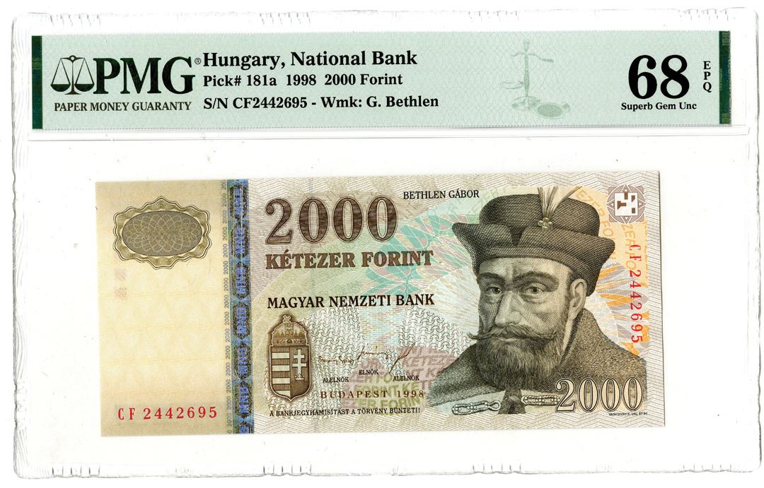 Hungary. 1998. 2000 Forint, P-181a, Issued banknote, Brown on multicolor underprint, S/N CF2442695, Watermark: G. Bethlen, PMG graded Superb Gem Uncirculated 68 EPQ. Tied with 2 other notes as highest graded in the PMG census.