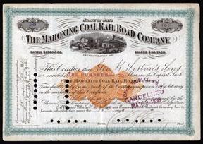 Ohio. 1871-73 (date not completely signed when issued, but the stock was cancelled in 1881). Issued and punch cancelled. 100 Shares, #489. Green border, locomotive by river with steamboat. Orange imprinted revenue RN-U1. VF. Rare certificate. Scarce revenue imprinted stock certificate.