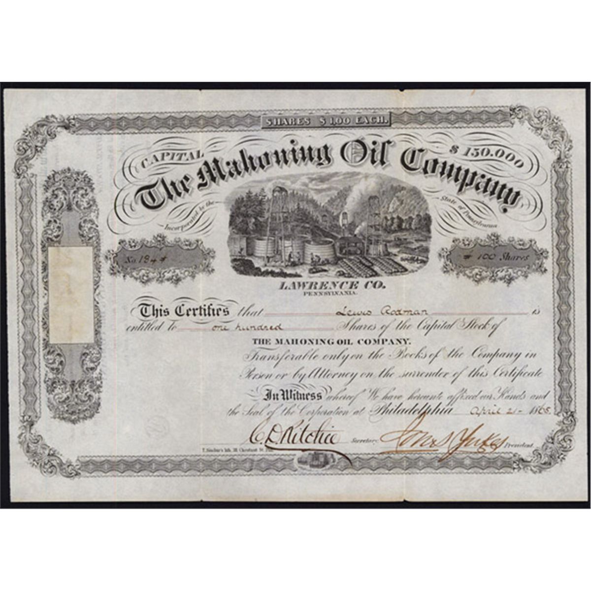 Lawrence Co., Pennsylvania, 1865, 100 Shares, Issued and uncancelled stock certificate, Black on white paper with no underprint, Oil wells and barrels on top middle, Revenue stamp missing on left, otherwise the certificate looks VF to XF, Cert.# 184. Attractive Pennsylvania oil company.