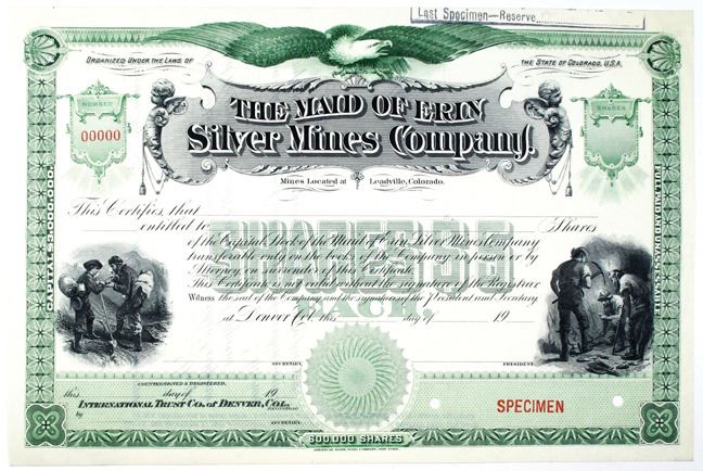 Leadville, Colorado. (Office located in Denver). ND (1900-1920s). Odd Shares Specimen Capital Stock Certificate, Black text with green border and underprint, Men at work above ground at left, men at work in mine at right, eagle at top. Red specimen overprint, specimen stamp at top right corner, 00000 serial numbers, and POCs. VF condition, ABNC. Mines were located at Leadville, Colorado. John McCombe discovered the mine in 1877. McCombe, about age 30 at the time, was born in Ireland, hence the name of the mine. (John E. Herzog Collection)