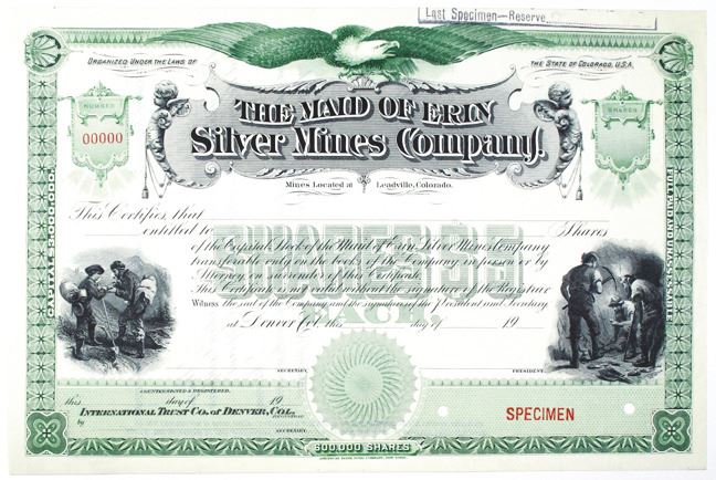Leadville, Colorado..... (Office located in Denver). ND (1900-1920s). Odd Shares Specimen Capital Stock Certificate, Black text with green border and underprint, Men at work above ground at left, men at work in mine at right, eagle at top. Red specimen overprint, specimen stamp at top right corner, 00000 serial numbers, and POCs. VF condition, ABNC. Mines were located at Leadville, Colorado. John McCombe discovered the mine in 1877. McCombe, about age 30 at the time, was born in Ireland, hence the name of the mine. (John E. Herzog Collection)
